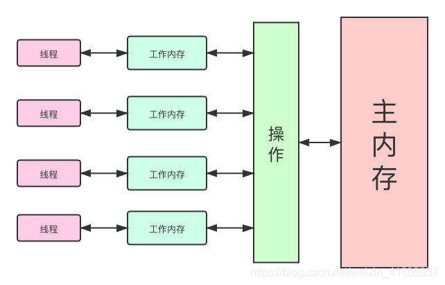 所有的共享变量都存储于主内存,这里所说的变量指的是实例变量和类变量,不包含局部变量,因为局部变量是线程私有的,因此不存在竞争问题。每一个线程还存在自己的工作内存,线程的工作内存,保留了被线程使用的变量的工作副本。线程对变量的所有的操作(读,取)都必须在工作内存中完成,而不能直接读写主内存中的变量。不同线程之间也不能直接访问对方工作内存中的变量,线程间变量的值的传递需要通过主内存中转来完成。